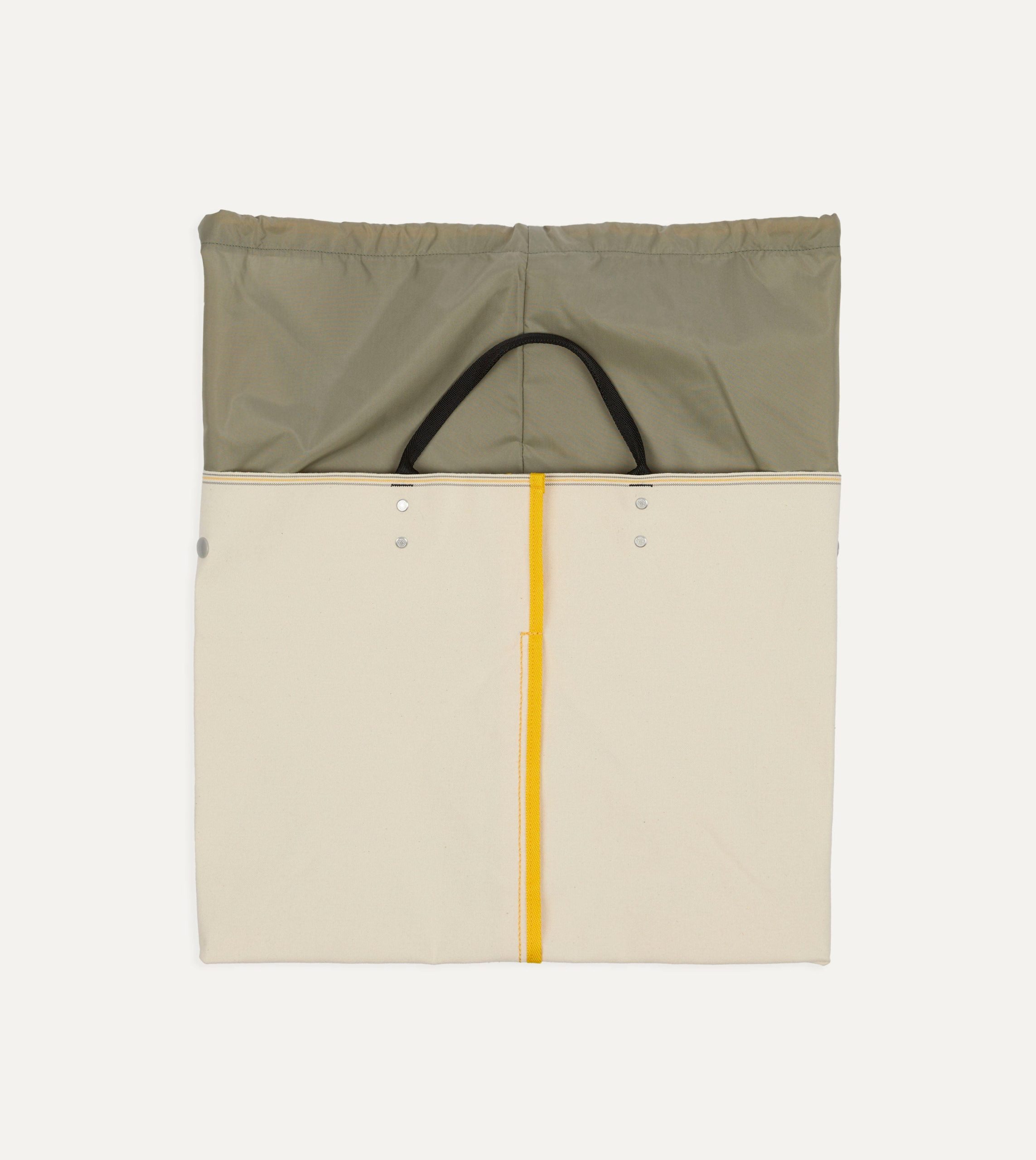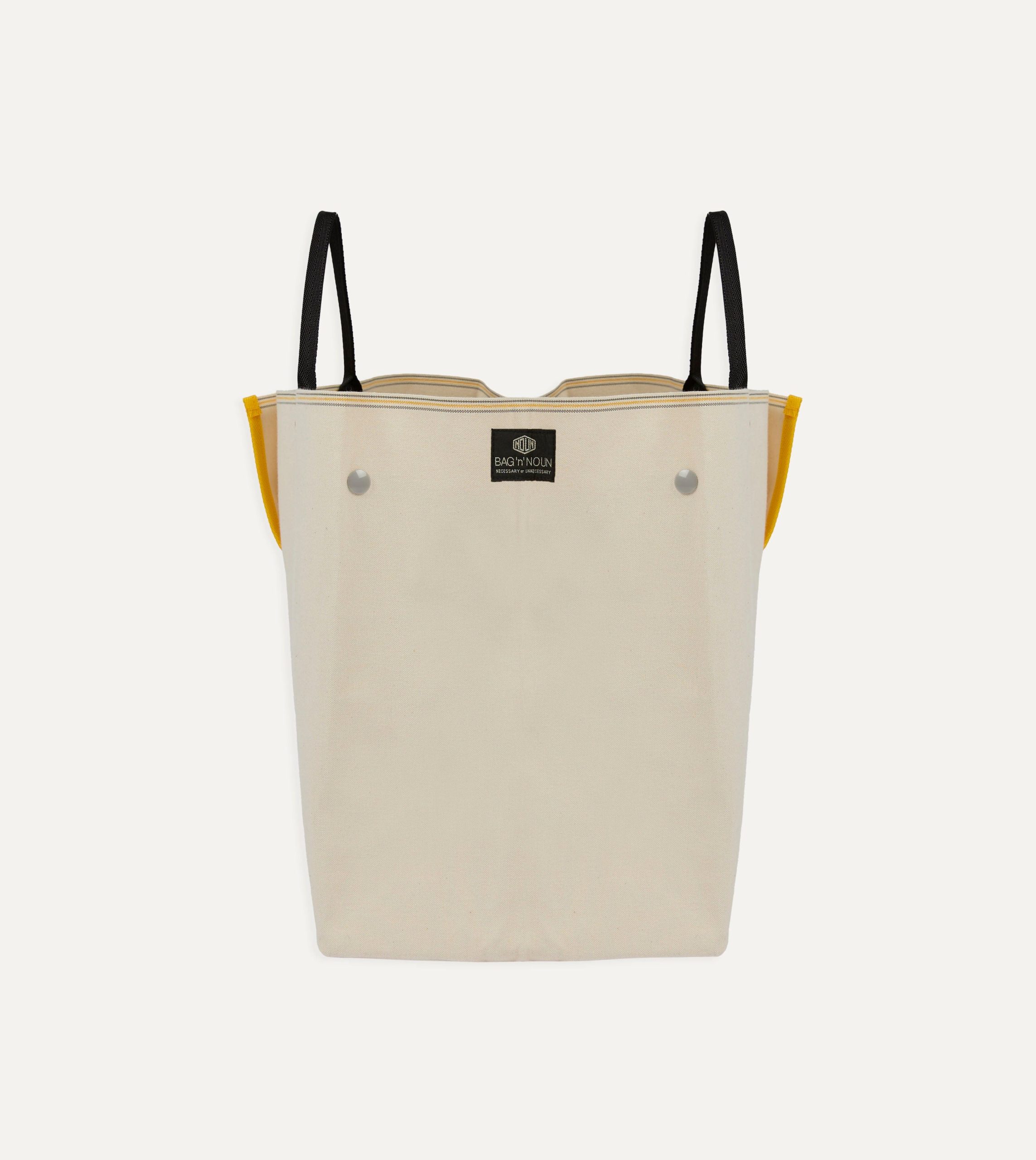 A refined tote in durable cotton canvas with a removable nylon drawstring bag secured by snap buttons inside. and featuring such thoughtful detailing as subtle notches near the handles. designed for comfort whether carried over the shoulder or at the elbow.