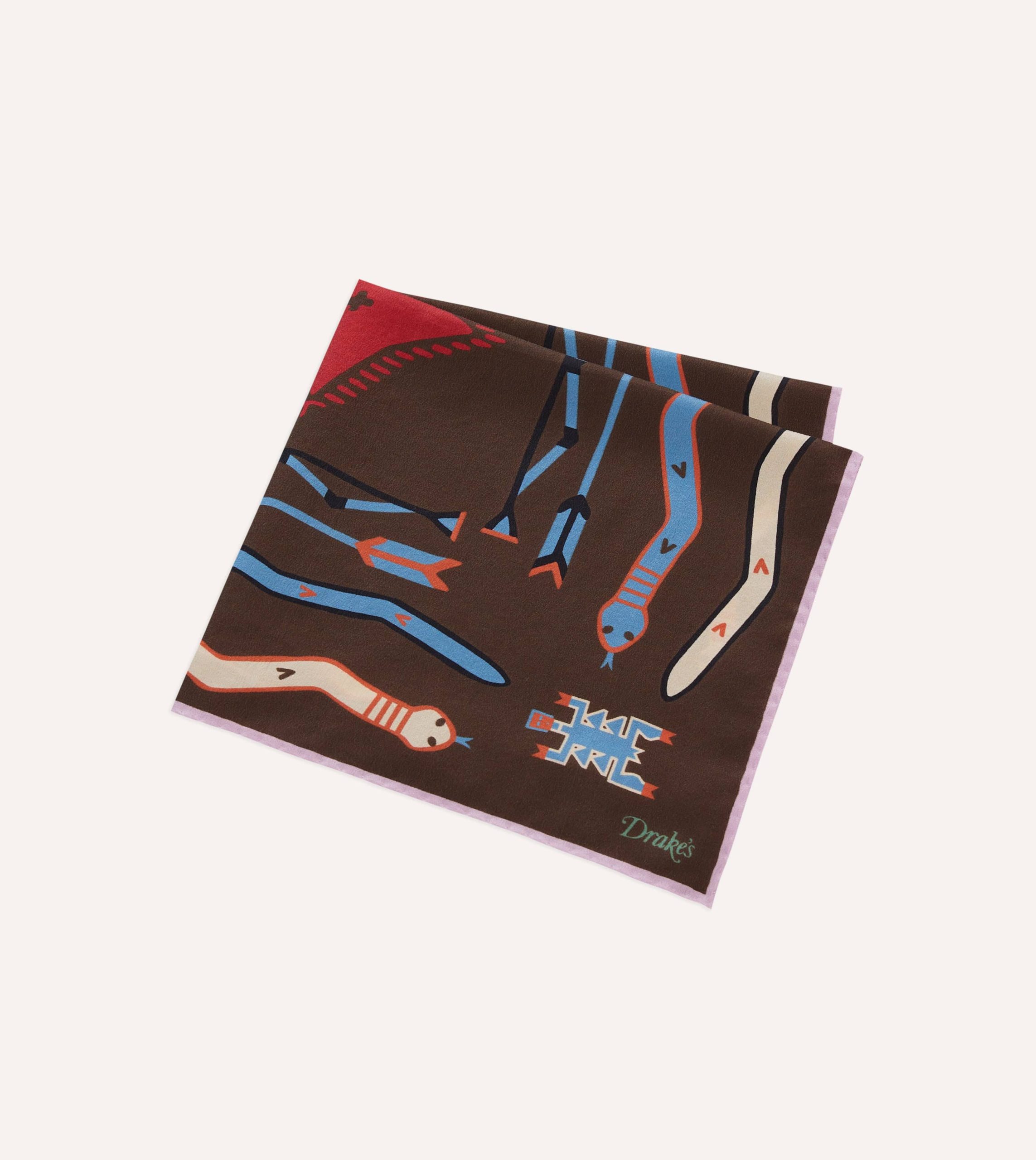 Taken from our extensive design archive. this tribal motif has been vividly applied to a pure silk. creating a dynamic visual contrast however it is folded (or stuffed) in one’s pocket.
