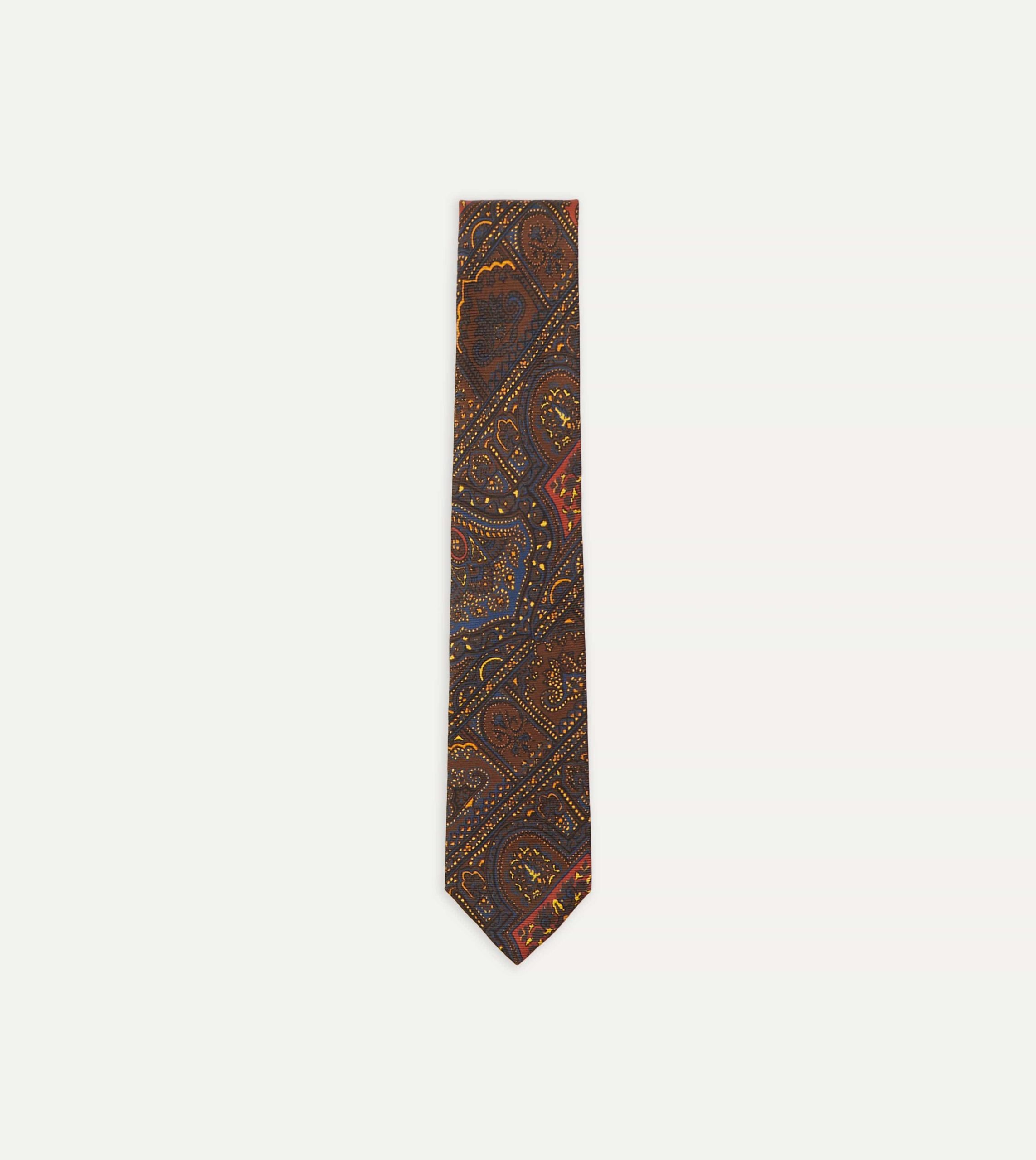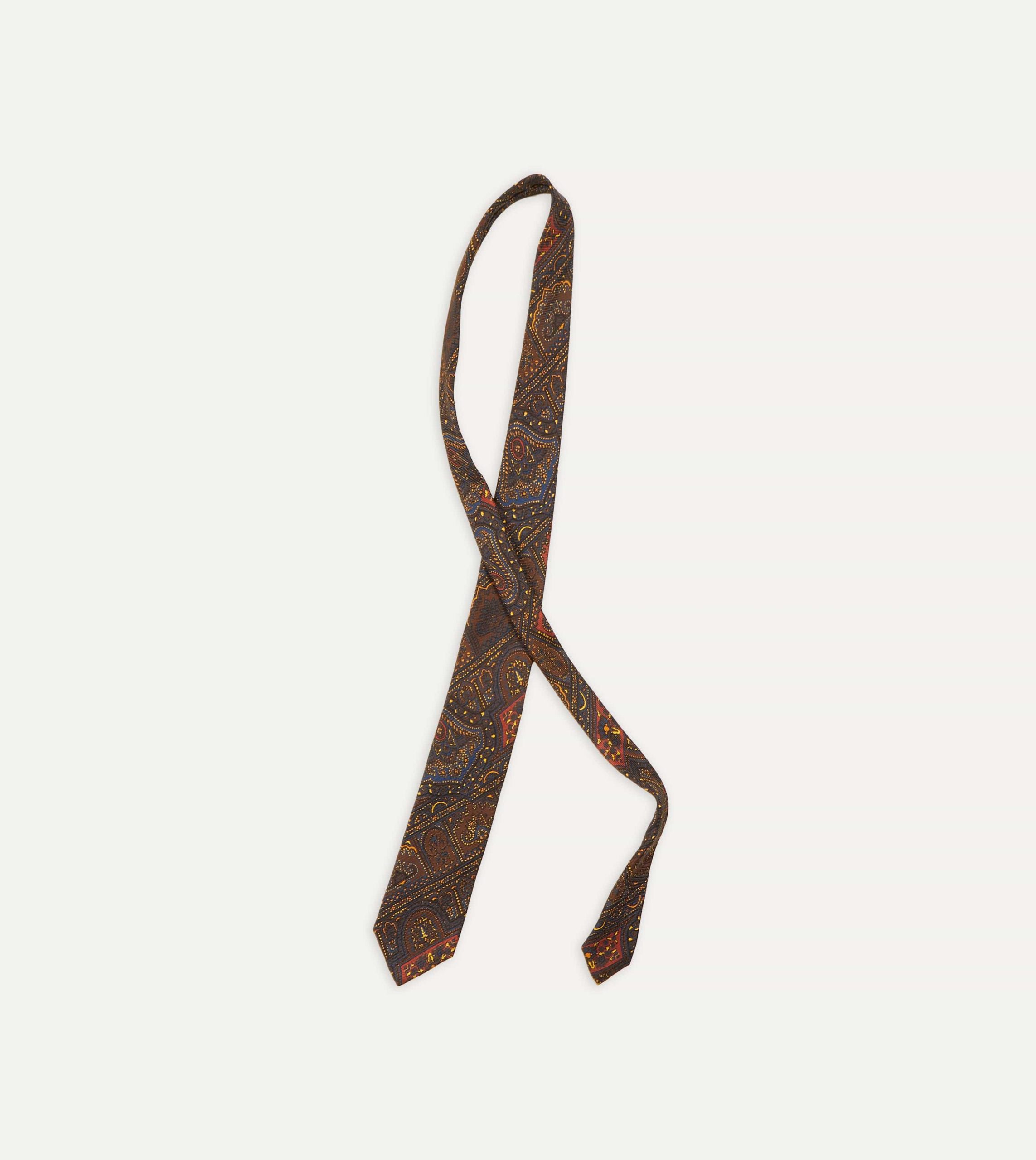 This design. direct from our extensive archive and printed on a substantial madder twill silk. features a classic paisley. and is reminiscent of the elegant late 1960s neckwear favoured by rockstars and royalty alike. The tie is pure silk with hand-rolled blades. made by hand in London.