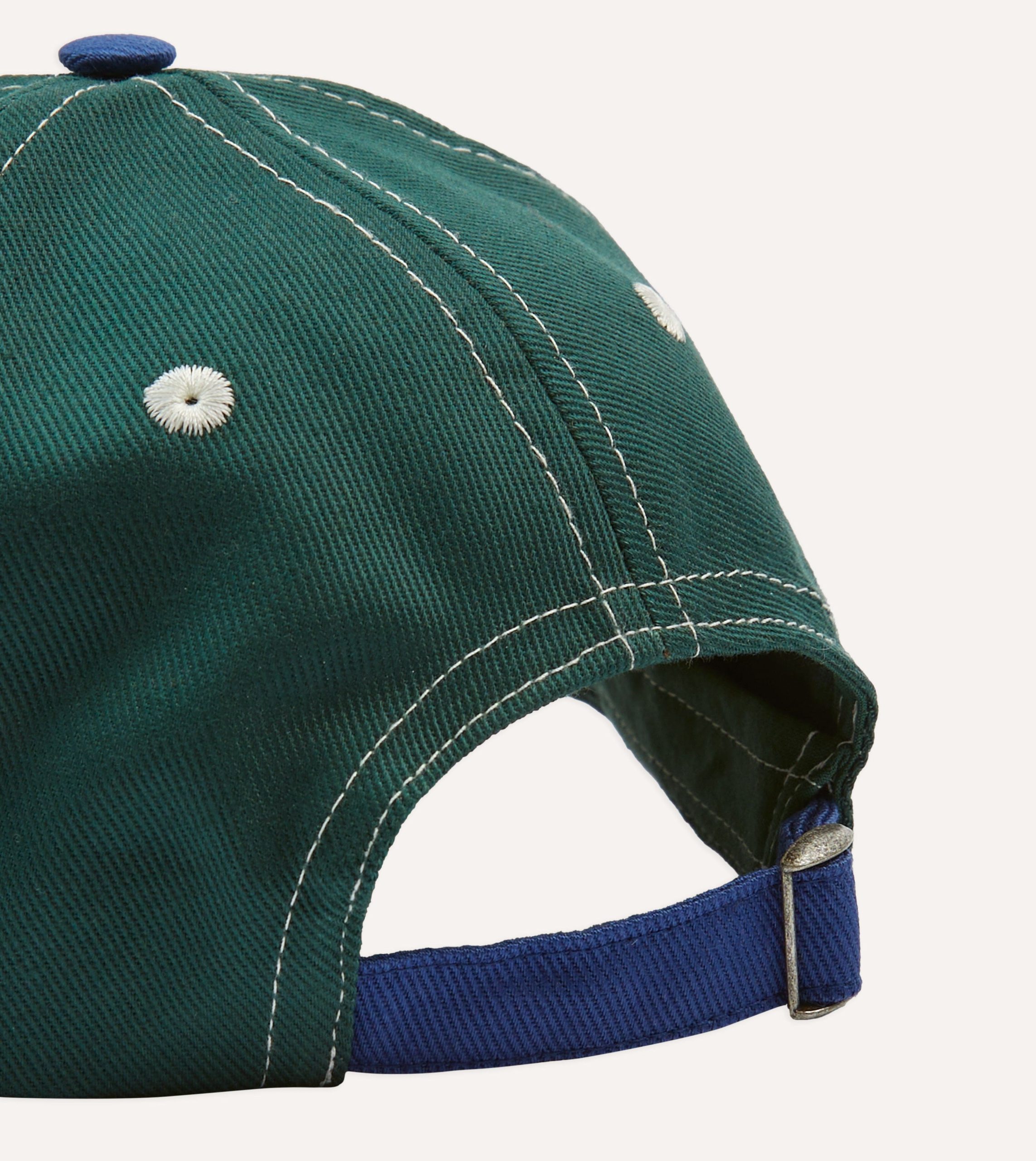 This six-panel cap is made from a Japanese cotton twill. with a soft crown and a gently curved peak. it has a relaxed silhouette which brings to mind an earlier era of athletic clothing. alongside the appliqué monogram.