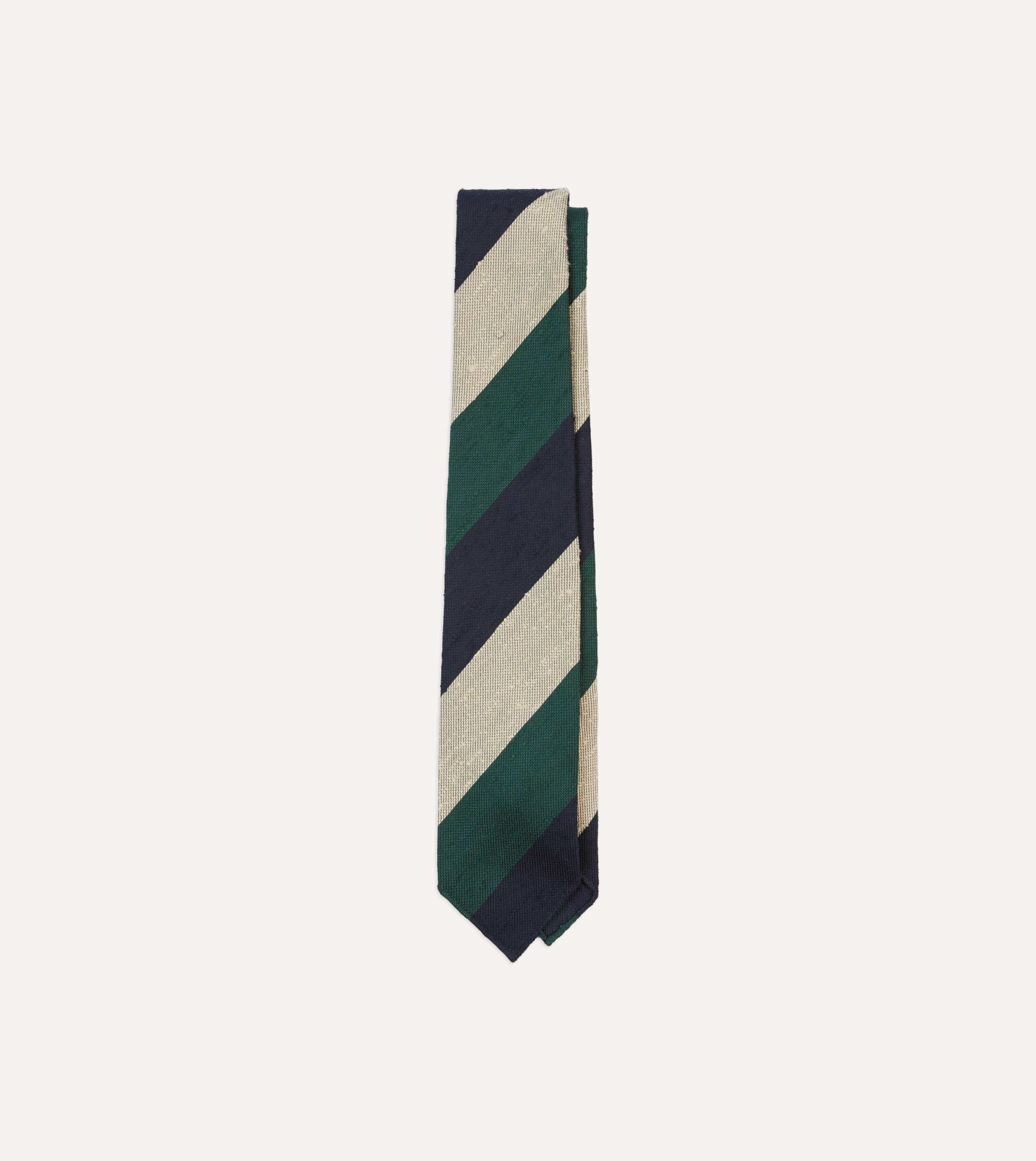 Navy. Green and Ecru Block Stripe Shantung Silk Tie