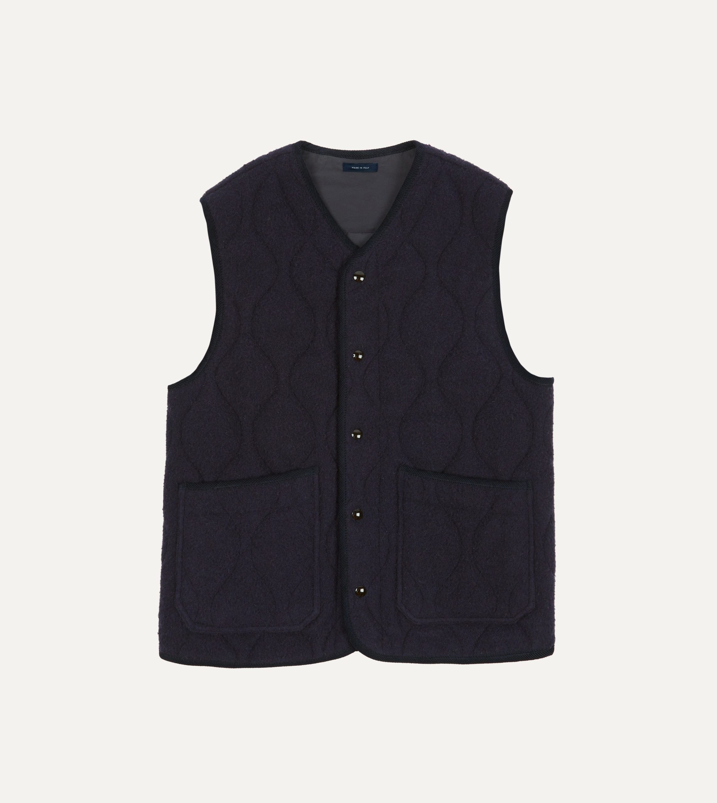 A sporty piece of outerwear with an undeniably rugged charm. this quilted vest takes its cues from hiking and equestrian clothing. Cut from a textured and storied Casentino wool. prized for its resilience and weather-proof properties. and generously wadded with recycled wool to create a pleasingly voluminous effect. the jacket is finished with five snap buttons. wide front pockets. and 14 wale corduroy piping.