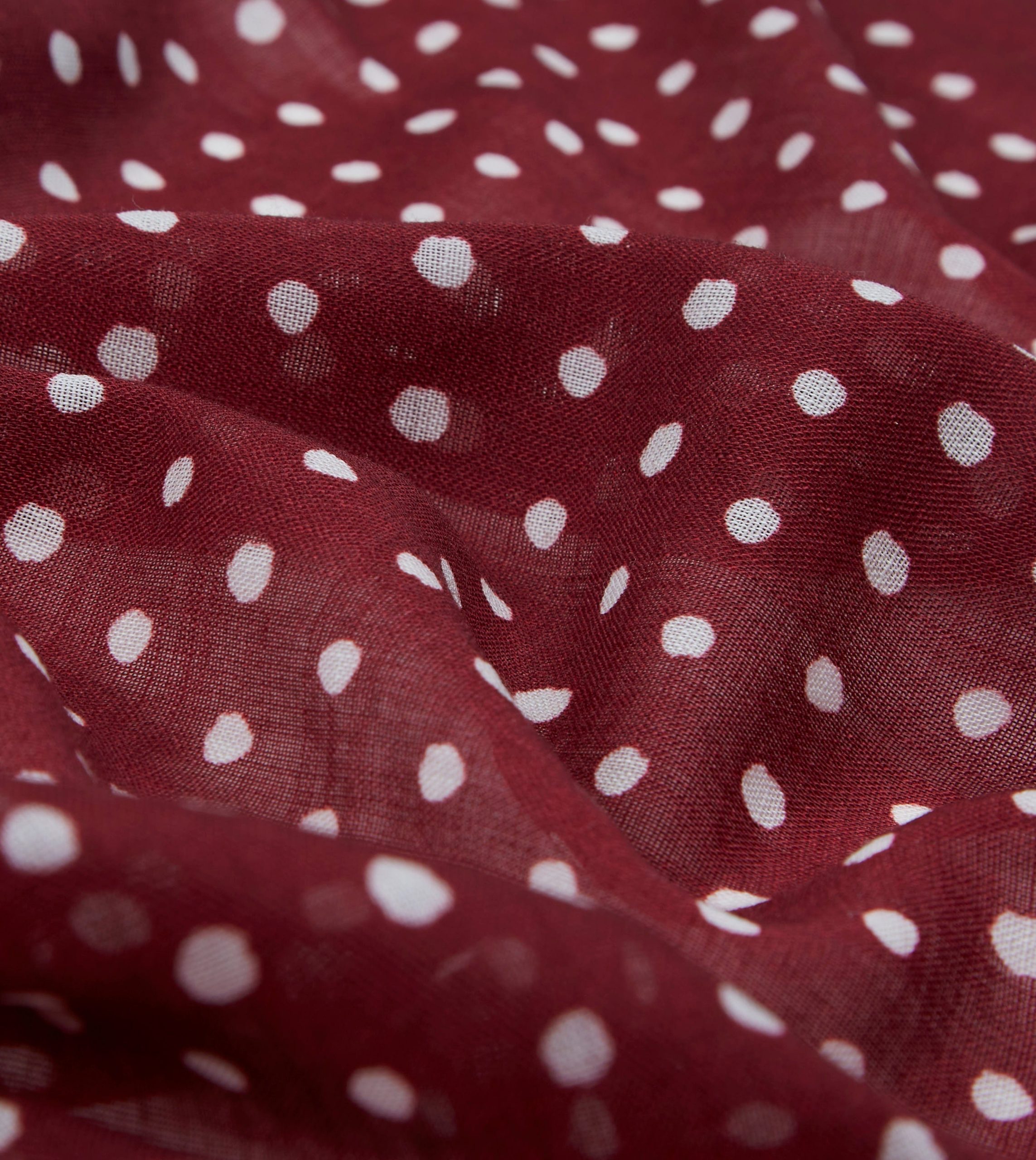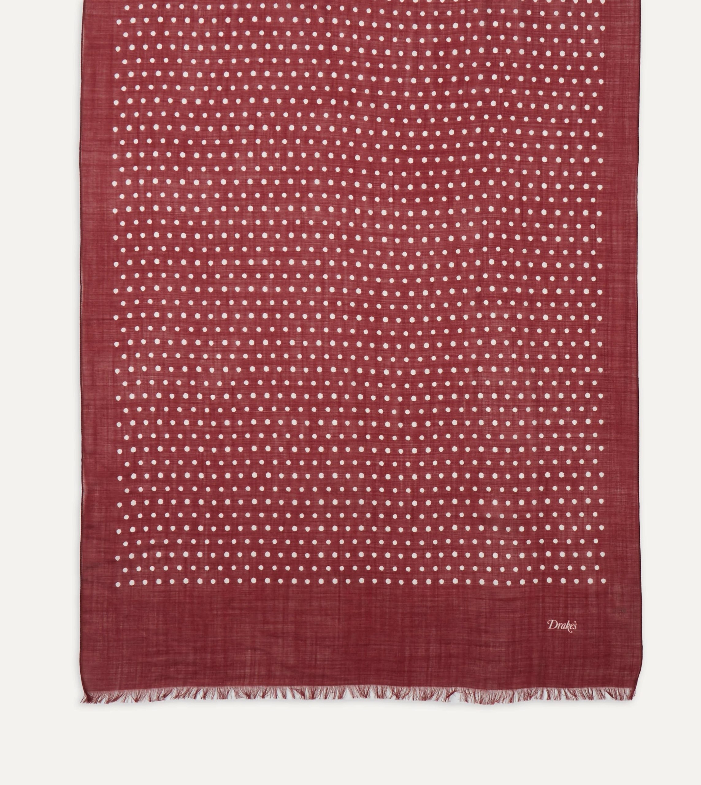 Woven from a lightweight. airy wool. this scarf is printed with a classic polka dot design from our extensive archive. and features eyelash fringing at both ends for an airy addition to your cold-weather arsenal.