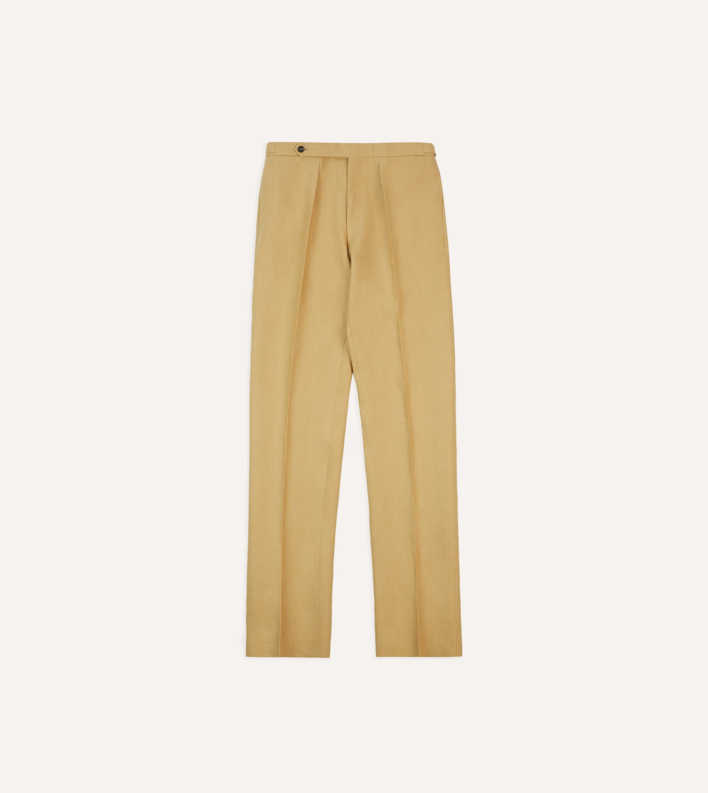 Crafted from a breezy Irish linen. the half-lined trousers feature understated details such as an extended tab front. French bearer buttoning with interior waistband curtaining. an after-dinner split to the rear. and side adjusters in lieu of belt loops.